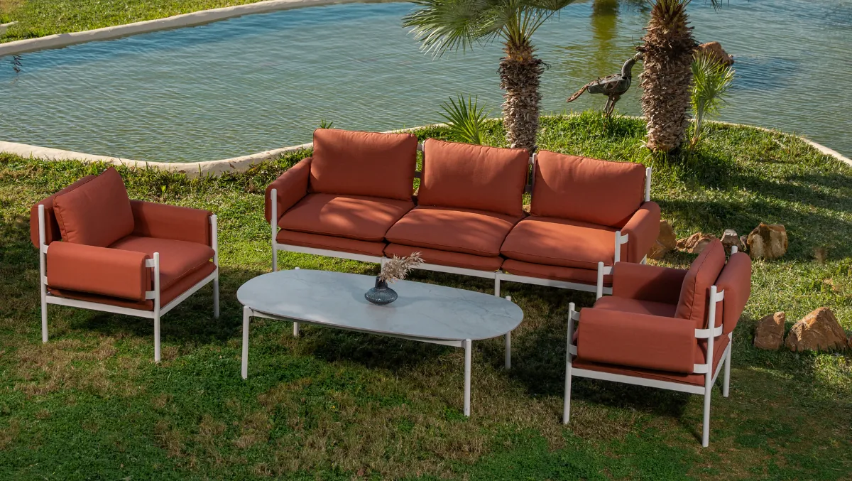 Nouvelle Collection Outdoor 2026 Véritable expression du luxe contemporain en extérieur, cette création incarne une vision raffinée de l’art de vivre en plein air. Les lignes épurées de la structure en aluminium, d’une élégance absolue, dialoguent avec des coussins somptueux aux volumes parfaitement maîtrisés, habillés de teintes chaleureuses et sophistiquées. Chaque détail a été pensé pour sublimer l’espace : proportions équilibrées, finitions impeccables et confort enveloppant. La table centrale, au design minimal et noble, complète cet ensemble avec discrétion et caractère, créant une atmosphère exclusive, à la fois moderne et intemporelle. Conçue pour des terrasses d’exception et des jardins prestigieux, cette collection incarne le luxe durable, où esthétique, qualité et bien-être ne font qu’un.