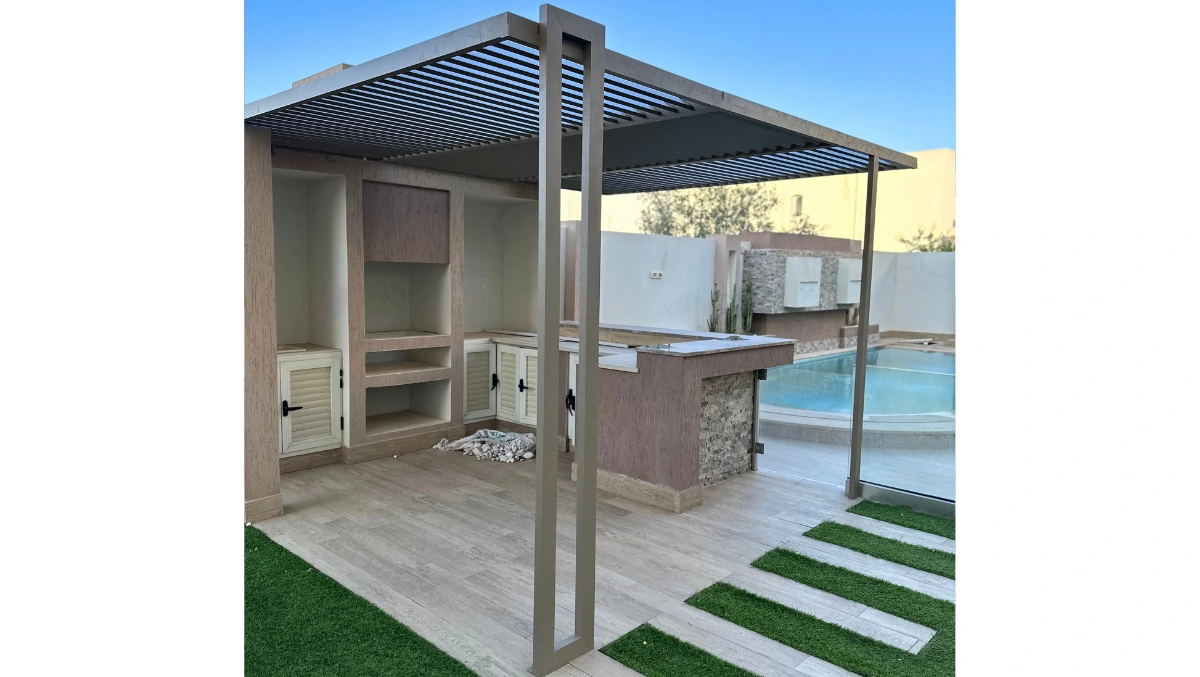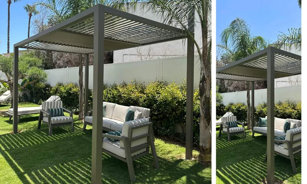 La pergola en aluminium avec lames orientables est une structure extérieure moderne et élégante, un meuble de jardin sophistiqué conçu pour offrir à la fois confort et esthétisme.